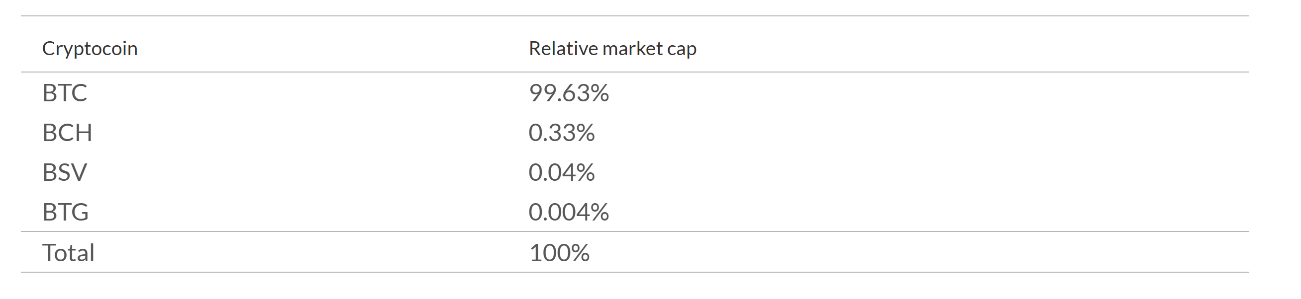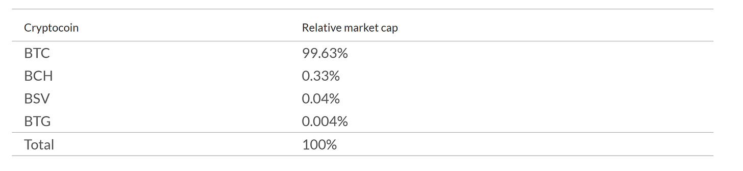 Note: Percentages represent the relative share of total market capitalization within the bitcoin ecosystem (BTC + BCH + BSV + BTG).